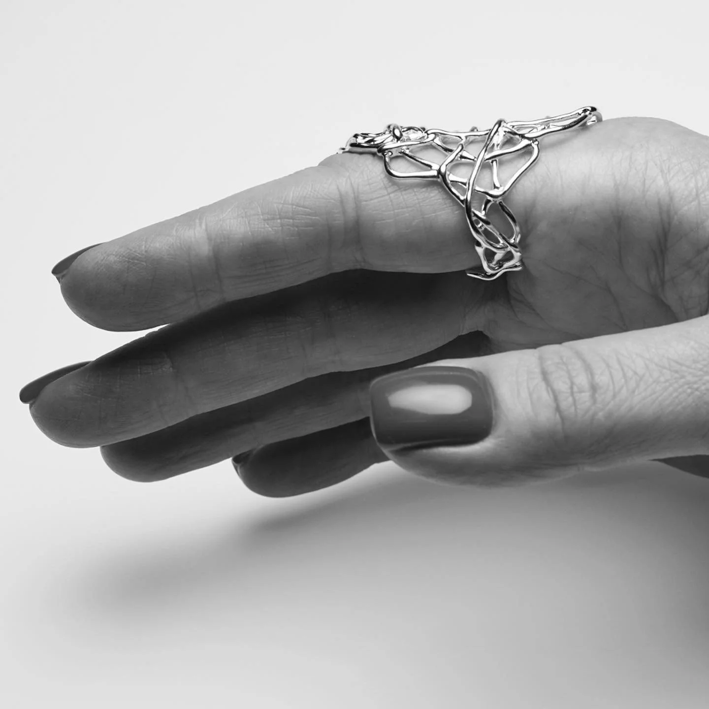 “I am not using gemstone settings in my work”, says Olga Schulman, “I just prefer to keep pure original shapes, to use and to enhance the natural beauty of the silver metal. I love creating complicated, intricate pieces that can make a bold fashion or lifestyle statement."